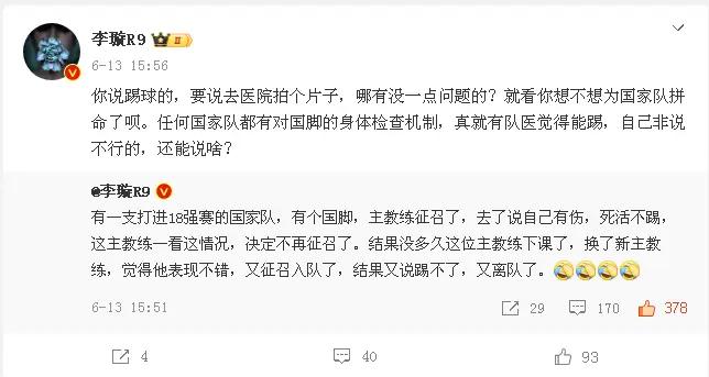 有意思的是,在回复网友的评论时,该名记又发了一番感慨:踢球的要去医院拍个片子,怎么可能没一点问题的?就看你想不想为国足拼命。国家队都有对国脚身体检查的机制,如果(国家队)队医认为能踢而球员自己非说不行,那还能说啥?