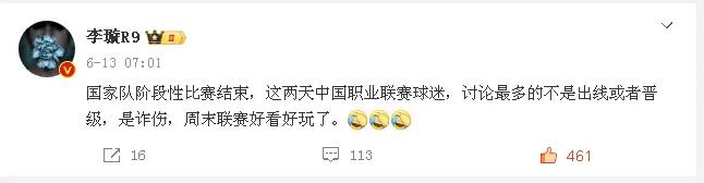 而在“讲故事”之前,名记先用两句“开场白”来“清嗓子”:随着国家队阶段性比赛结束,球迷这两天讨论最多的不是出线或者晋级,而是诈伤,“周末联赛好看好玩了”。