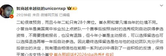 媒体人王健发文点评说道:二轮很难预测,而且今年二轮只有28个席位。崔永熙和曾凡博当年的处境不同。小曾当年是美国高中毕业加上点燃队一个赛季后按照当时的选秀规则自动获得参选资格,不需要提前报名,也没有退路。