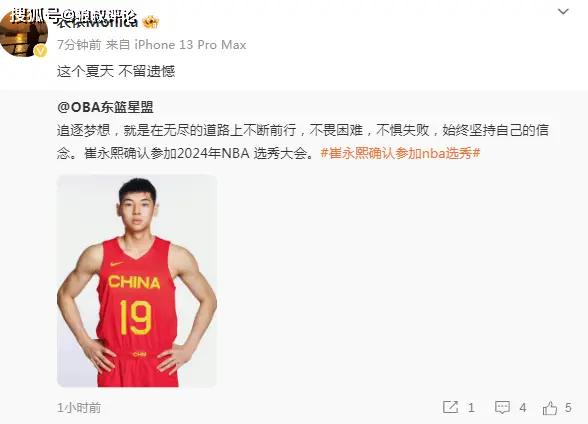 李群篮球培训机构的账号同样发文:追逐梦想,就是在无尽的道路上不断前行,不畏困难,不惧失败,始终坚持自己的信念。崔永熙确认参加2024年NBA 选秀大会。