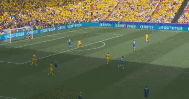 乌克兰后卫回传,门将卢宁大脚传球,皮球被丹尼斯-曼直接断下,后者分球,斯坦丘迎球轰出一脚世界波,帮助罗马尼亚1-0领先。