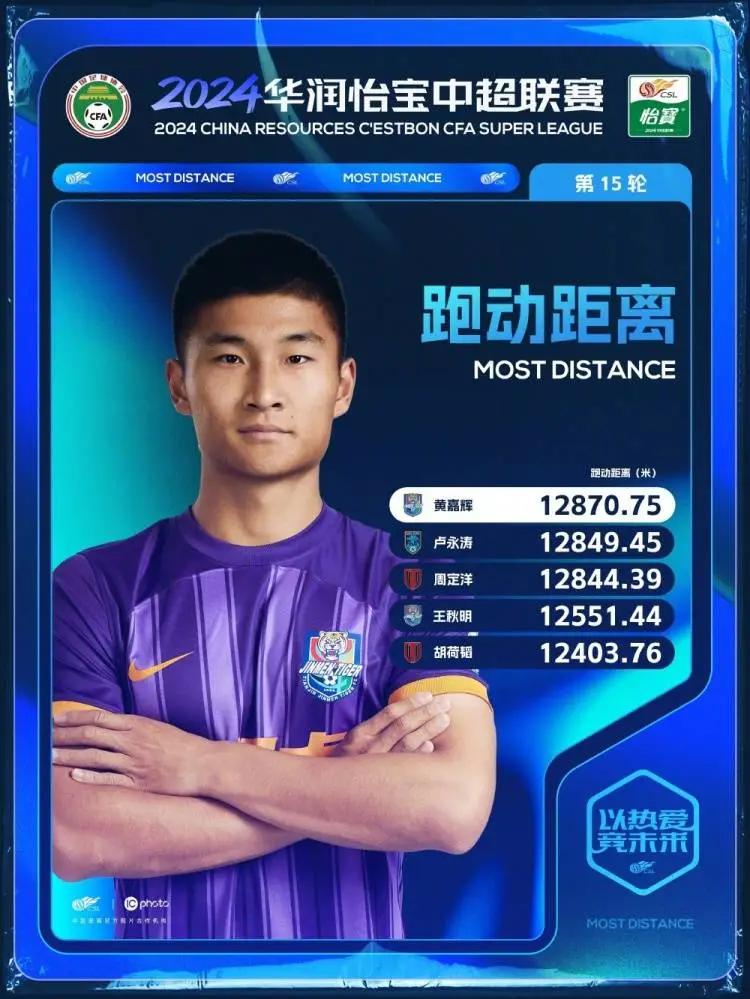 直播吧6月17日讯联赛第15轮结束后,中超官方公布了这一轮的跑动距离榜,排在榜首的是跑动12870.75米的黄嘉辉,本期第四名是他的队友王秋明。不过尽管球员表现积极,但他们所效力的天津津门虎本轮还是0-3负于上海海港。