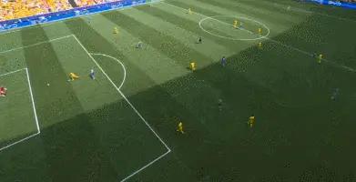 第39分钟,斯坦丘发出角球,只见皮球在空中划出一道美妙的弧线,直挂对手的球门。乌克兰队门将卢宁高高跃起扑球也没有够着,皮球刚好越过他高高伸出来的五指,砸到球门横梁之上,再反弹到球场内(下图)。