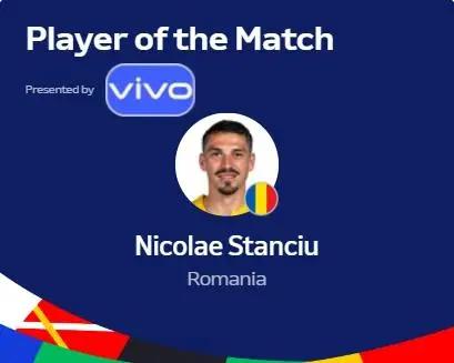 直播吧6月17日讯 欧洲杯小组赛E组第1轮,罗马尼亚3-0完胜乌克兰。赛后,欧足联官方宣布,斯坦丘当选本场比赛最佳球员。