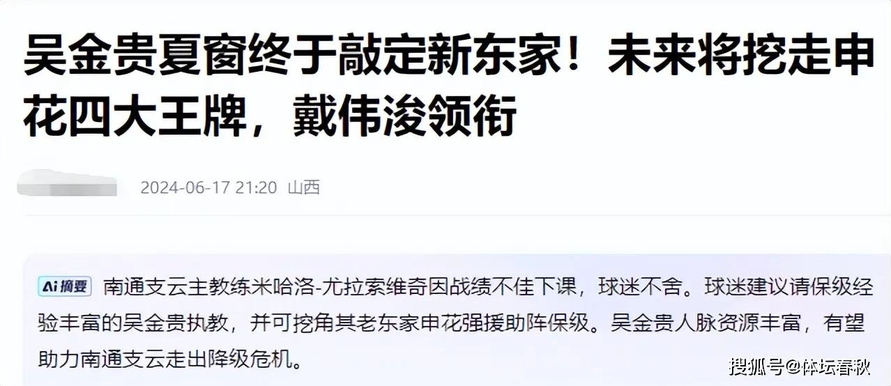 另外值得一提的是,在中超联赛执教多年,吴金贵在国内足球圈有不少人脉关系,这对于帮助球队保级也是非常重要的一种资源。吴金贵加盟南通支云后,可以挖角老东家上海申花,将一些在队中踢不上比赛的球员一起带到南通支云,帮助球队完成保级任务。