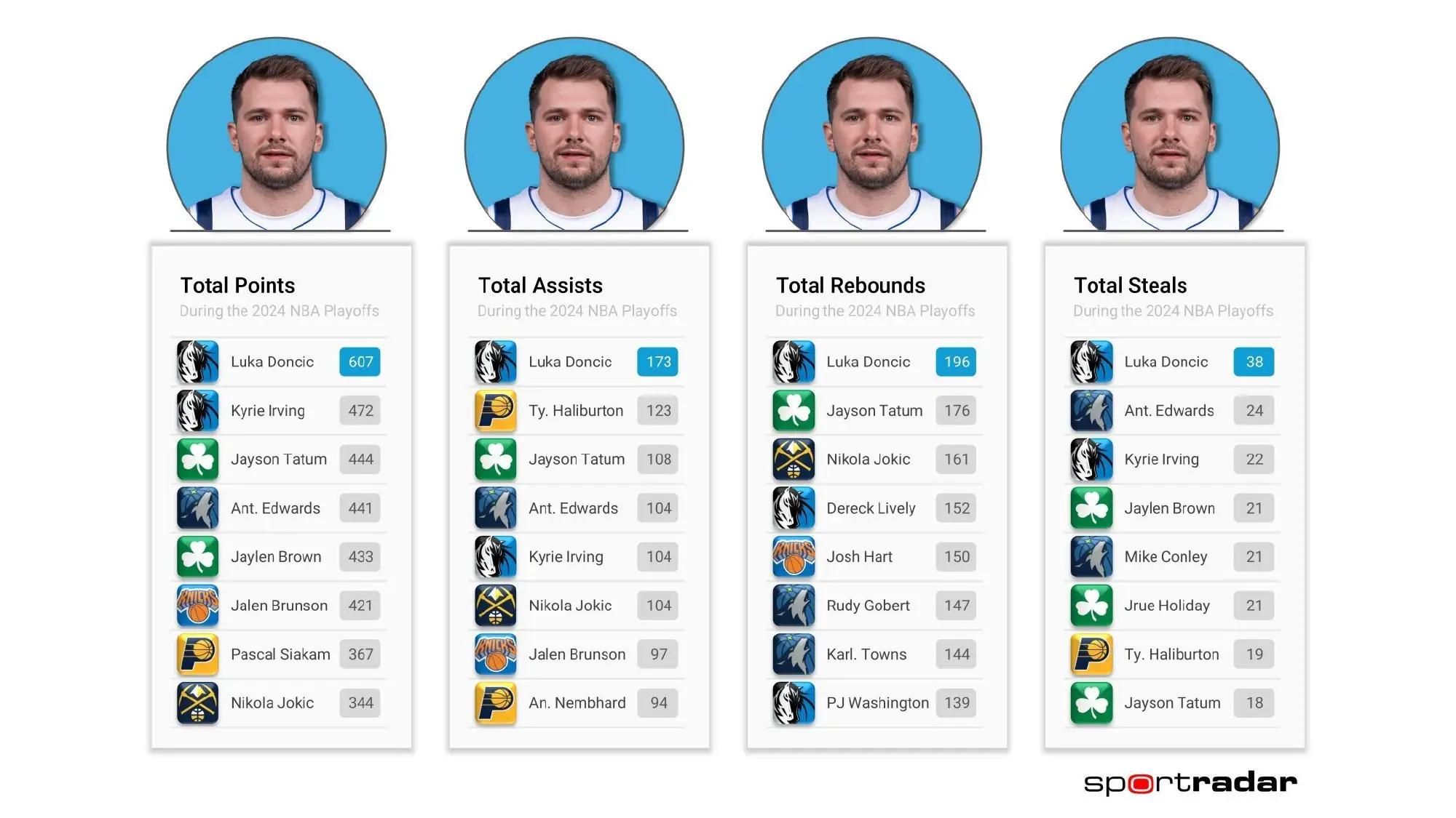 截止本场比赛开始前,卢卡-东契奇达成了一项极其伟大的成就。今年季后赛,东契奇的总得分(607)、篮板(196)、助攻(173)、抢断(38)全部是联盟第一,历史唯一。如果不出意外,他也将在总决赛打完后继续享有这历史唯一纪录。