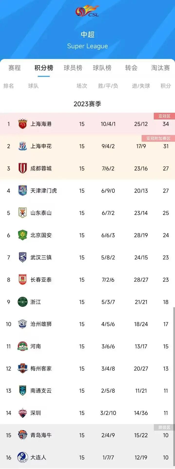 2023年中超半程积分榜