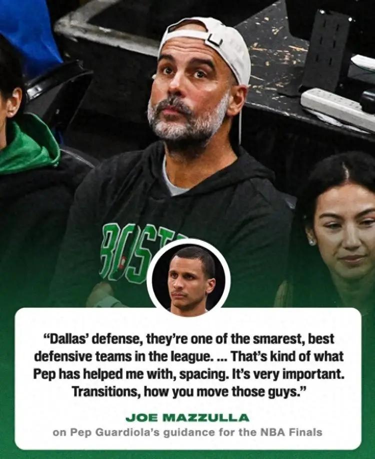赛后,凯尔特人主帅马祖拉接受了记者采访。谈到瓜迪奥拉对总决赛的指导,他说道:“独行侠的防守,他们是联盟中最聪明、防守最好的球队。瓜迪奥拉对我的帮助就是关于球场空间方面的。这非常重要。转换,你如何去移动这些家伙。”