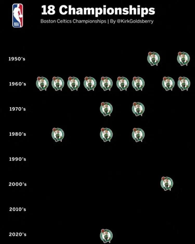 直播吧6月19日讯 今天,数据专家Kirk Goldsberry晒出了绿军夺冠年代分布图。