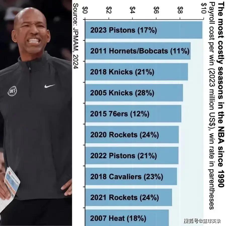 大概有多糟糕呢?在一份体育行业报告里,以当赛季薪资除去胜场数,算出赢一场球需要花多少钱,蒙蒂执教的2023-24赛季活塞被认为是NBA过去34个赛季最不划算的球队,他们平均赢一场球需要花费将近1000万美金。