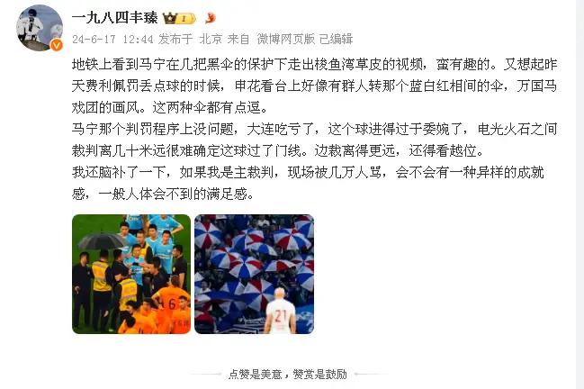 (我在)电铁上看到马宁在几把黑(色雨)的保护下走出棱角鱼湾草皮的视频,(感到)蛮有趣的。又想到昨天(6月16日,申花与成都蓉城之战)费利佩罚丢点球的时候,申花看台上好像有群人转那个蓝白红相间的伞,(那是整一个)万国马戏团的画风(啊),“这两种伞都有点逗”。