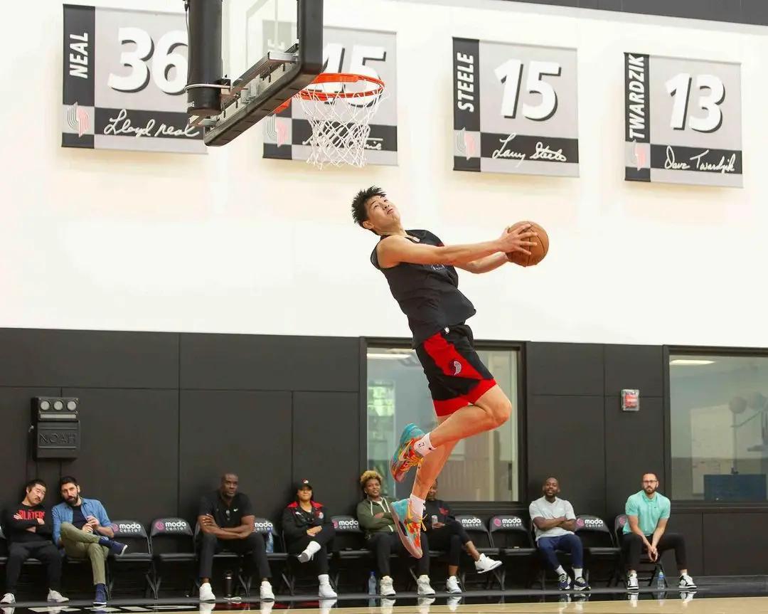 北京时间6月21日,开拓者官方晒出中国球员崔永熙的试训照,照片中崔永熙完成了一记高难度背扣。