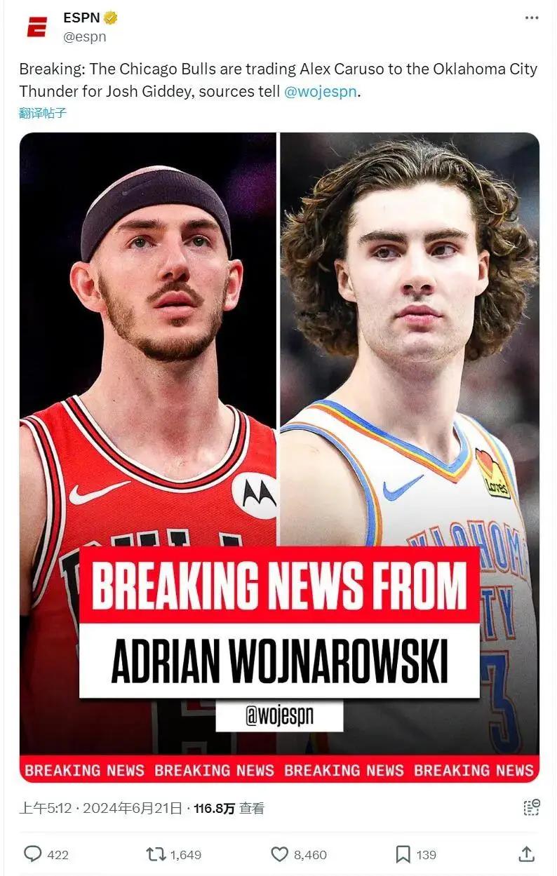 北京时间6月21日凌晨,休赛期第一笔交易诞生:据ESPN报道,雷霆将约什-吉迪交易至公牛,1换1交易得到卡鲁索。吉迪的合同还剩下最后1年835万,卡鲁索的合同还剩1年989万。消息一出,很多球迷惊呼:雷霆的防守要起飞了!