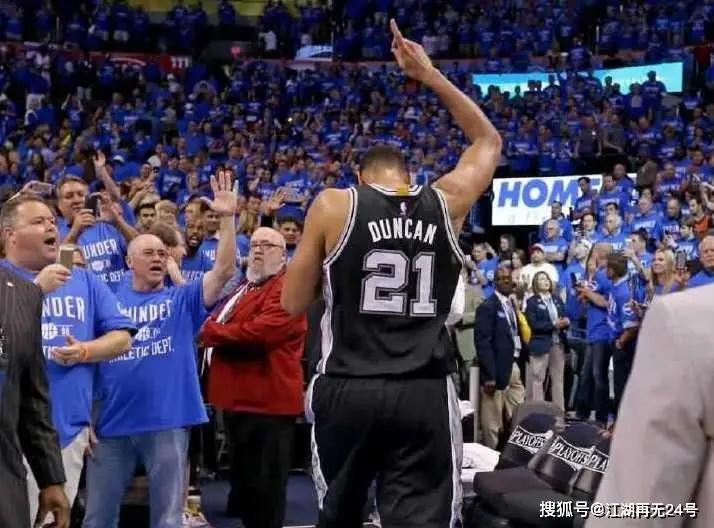 2016年西部半决赛G6,39岁的邓肯和他的马刺被年轻的俄克拉荷马雷霆淘汰出局。而就在这时,正如邓肯十几年如一日的那样,他把手指向天空,用一种虽然略有不甘而又安静的方式告别了这片热爱的赛场。随后在休赛期他低调地宣布了退役。邓肯从来不是那种张扬的人,他没有期待什么退役巡演,他以最低调的方式退役,却无法掩盖他历史第一大前锋的事实。谢幕战拿下19分5篮板的邓肯用他的青春和领导力以及团队精神带给了马刺辉煌。