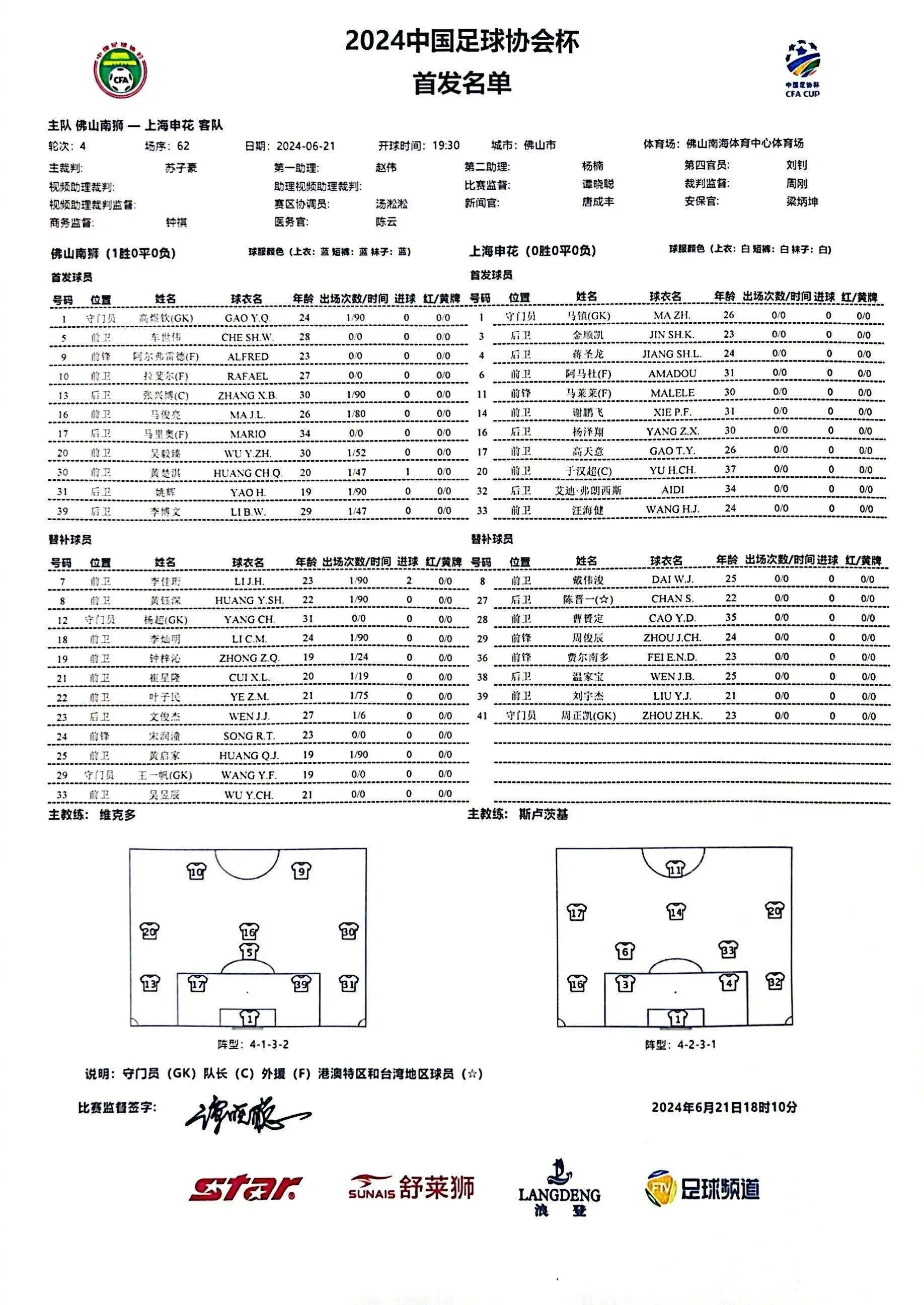 直播吧6月21日讯 北京时间19:30,足协杯第4轮,上海申花客场对阵中甲球队佛山南狮,赛前双方公布首发。