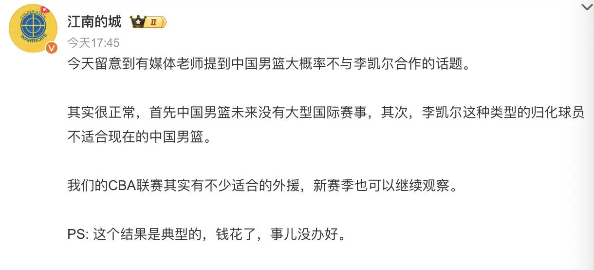 根据多位媒体人的爆料,中国男篮在归化球员上有了新思路,而首个归化李凯尔的国家队生涯应该已经结束了。