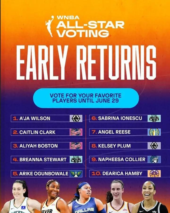 直播吧6月22日讯 今天,WNBA官方公布了今年全明星赛首轮票选的结果,王牌队球星阿贾-威尔逊暂居榜首。排名2-9位的球星分别为: