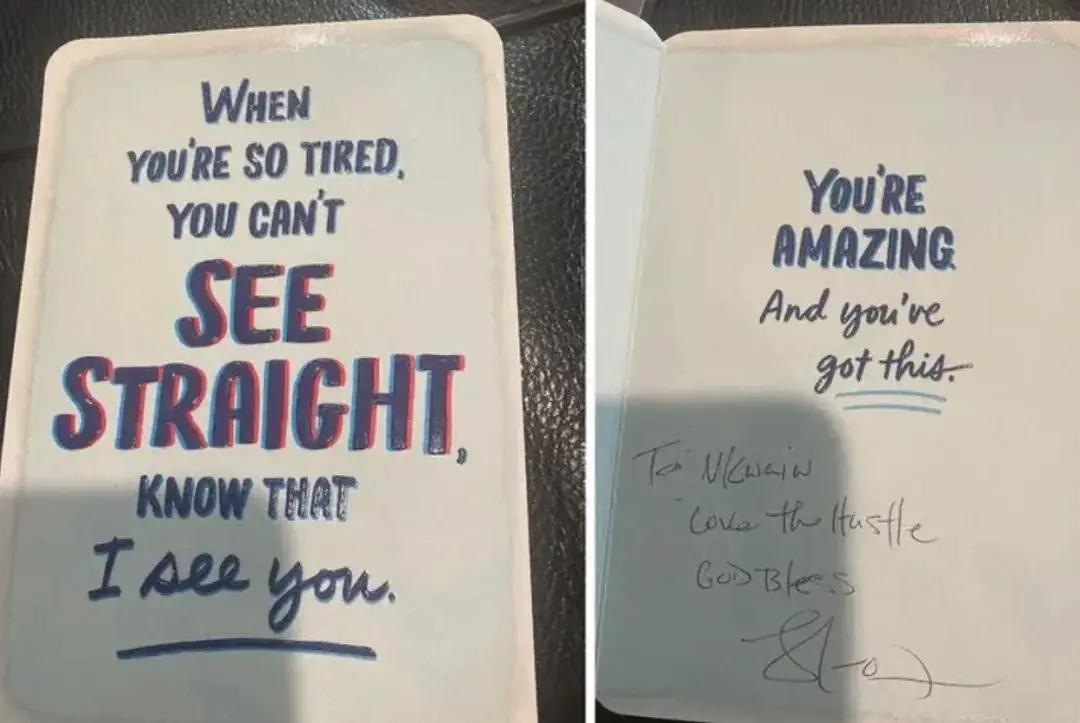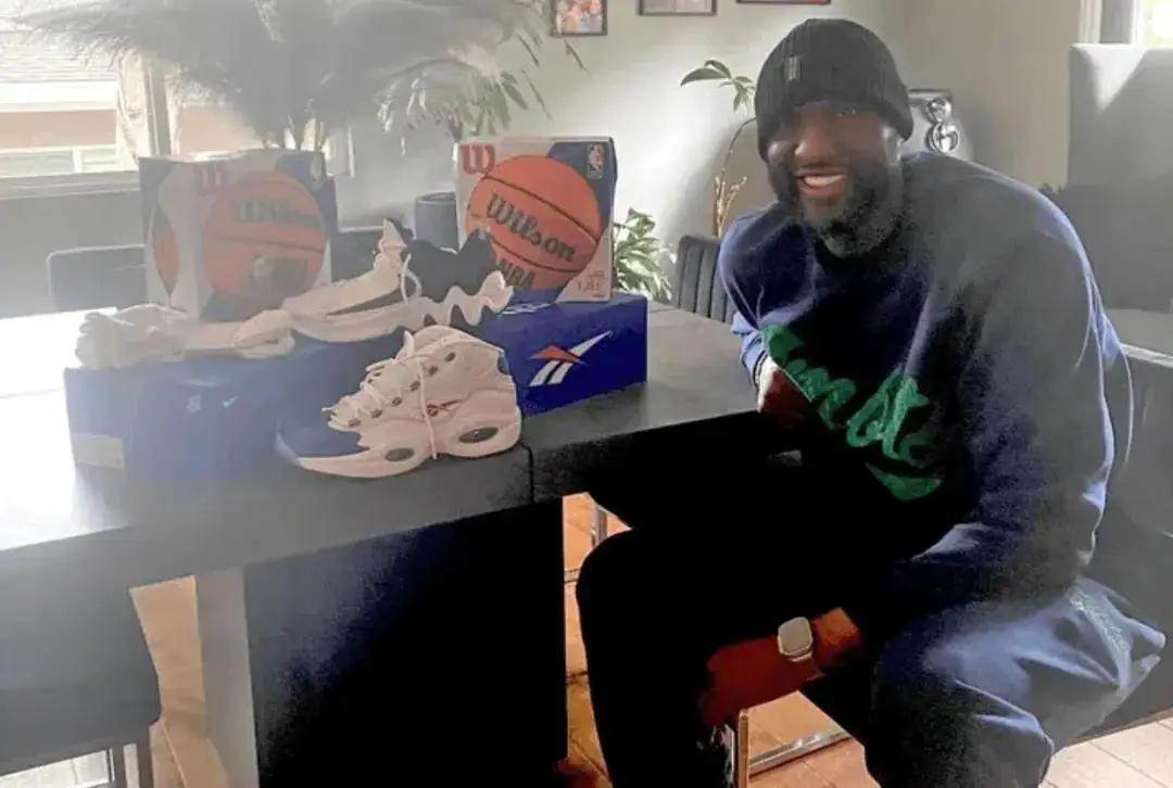 这些礼物包括两个篮球、艾弗森的签名鞋和字母的签名鞋,一些袜子和一张贺卡,卡上写着“致恩奎恩,大爱这种拼搏,上帝保佑你”。