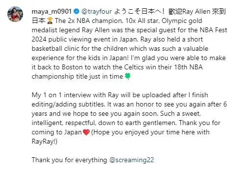 随后,日本混血NBA美女记者宫河麻耶晒出多张雷-阿伦日本行的照片,并且还使用中、日、英三种语言来发文——