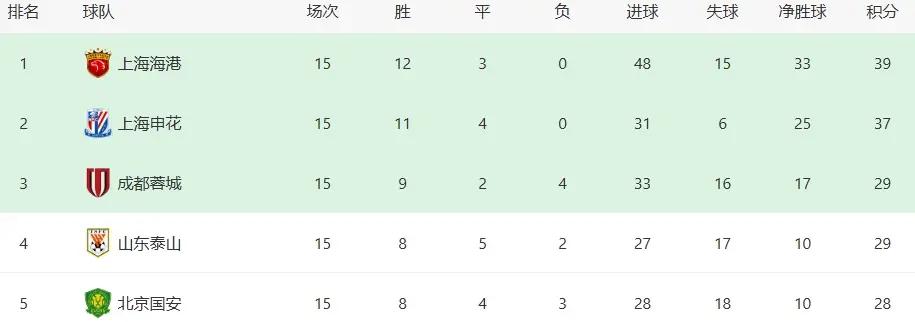 前面15轮战罢,上海海港的战绩可谓是傲视中超群雄,他们12胜3平,未尝败绩,积39分,狂轰48球,力压本赛季状态高光的上海申花,抢占了中超领头羊之位,荣膺中超半程冠军。