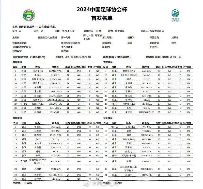 直播吧6月22日讯 北京时间19:30,足协杯第4轮,山东泰山客战对阵重庆铜梁龙,赛前双方公布首发。