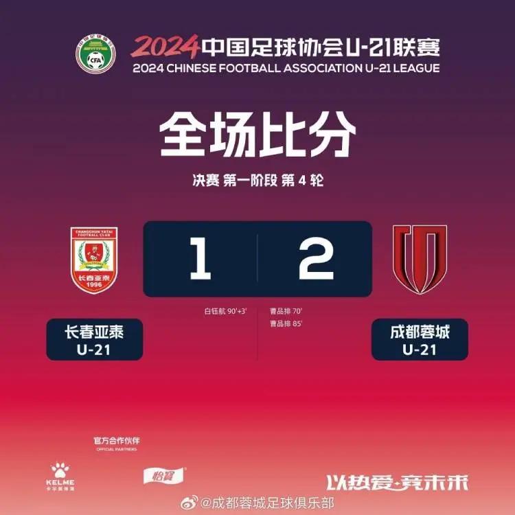 6月22日19:30,2024中国足球协会U-21联赛决赛第一阶段第4轮,成都蓉城U-21在日照国际足球中心主场馆作战,最终以2-1战胜长春亚泰U-21,小将曹品排梅开二度!蓉城小将们以四连胜圆满完成了第一阶段的比赛,7月将继续第二阶段的征程,让我们为他们加油喝彩吧!成都,雄起。