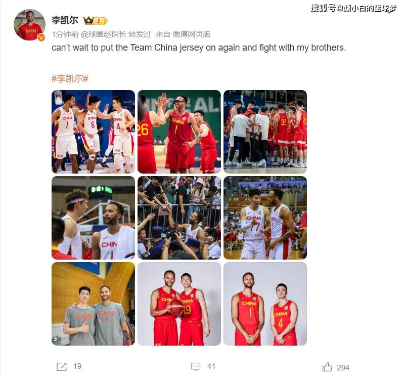 北京时间6月24日,NBA森林狼球员李凯尔在社媒上发声:等不及再次穿上国家队的战袍和兄弟们战斗了。