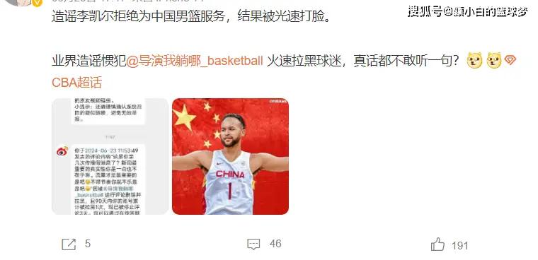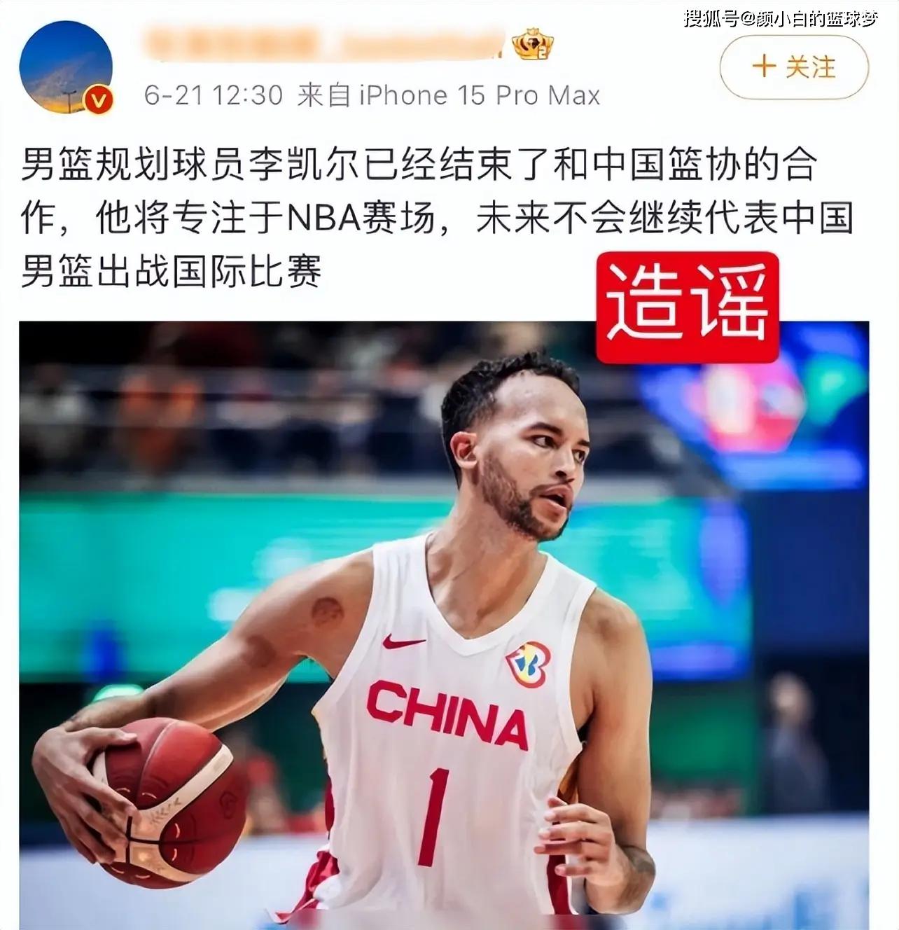 李凯尔的经纪人在社媒上怒斥这种不实消息——纯属个人自媒体不实炒作,完全不代表李凯尔本人的立场。李凯尔多次公开表示心系中国男篮,并在重要比赛中希望代表中国男篮出战,他还一直都与中国男篮多名成员保持沟通,7月他将前往拉斯维加斯看望中国男篮。