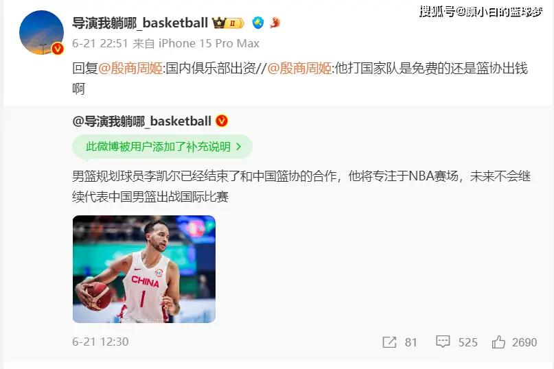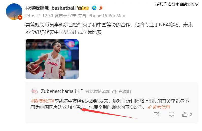 6月21日,篮坛大V导演我躺哪爆料,男篮归化球员李凯尔已经结束了与中国篮协的合作,他将专注于NBA赛场,未来不会继续代表中国男篮出战国际比赛。
