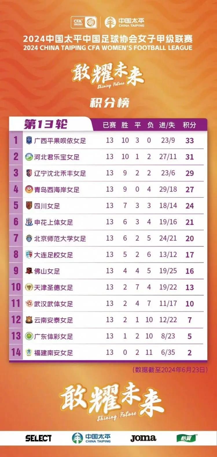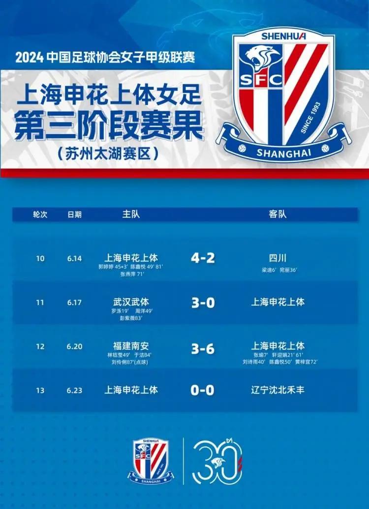 6月23日,2024中国足协女甲联赛第三阶段苏州太湖赛区的比赛全部战罢,申花上体女足本阶段4战2胜1平1负,进10球失8球,联赛前三阶段13轮6胜3平4负积21分、打入19球失16球,列积分榜第六位,成功晋级由积分榜前八名组成的争冠组。