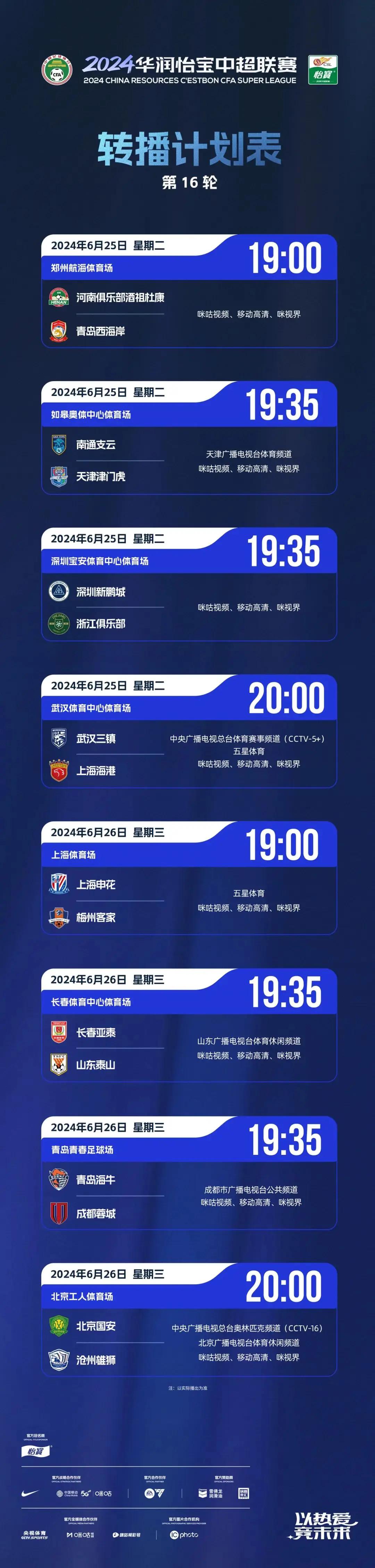 6月25日-6月26日,2024华润怡宝中超联赛将展开第16轮的较量,多家平台将对比赛进行转播。赛程过半,精彩加倍,不要错过!?