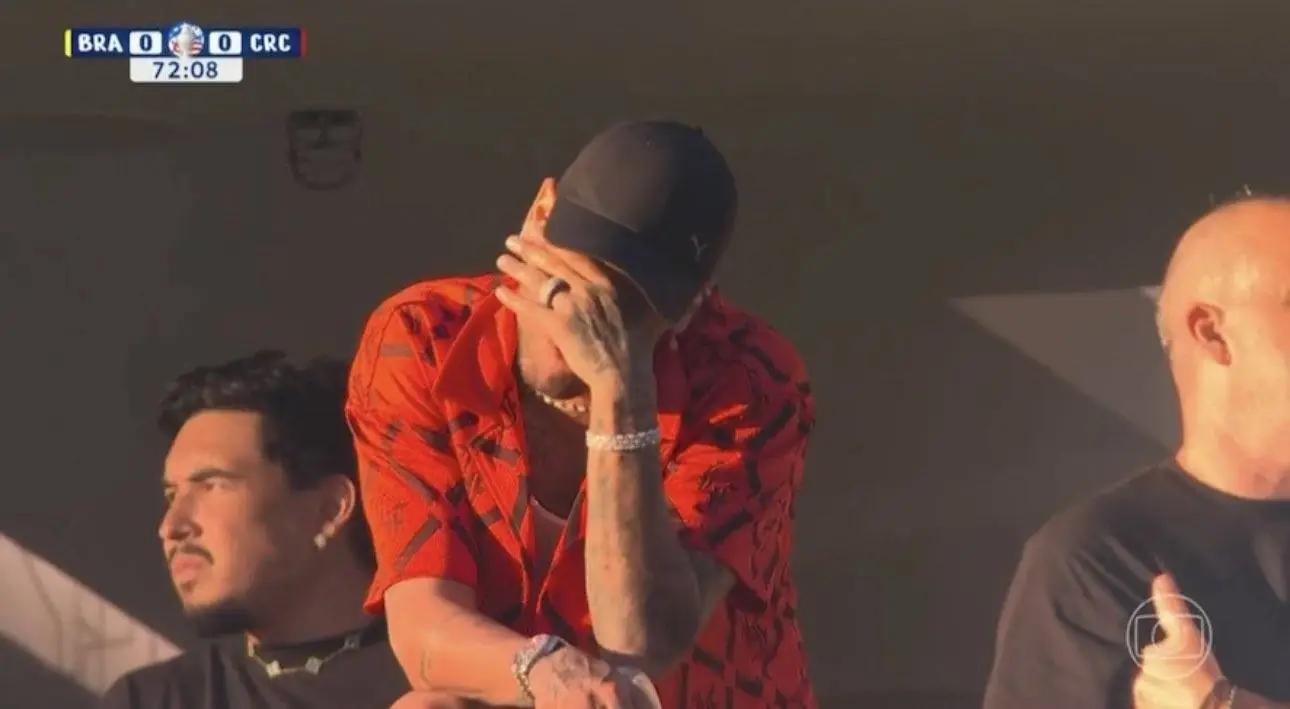 第72分钟,巴西右路传中出界。看台上的内马尔看的直捂脸,随后向镜头打招呼。