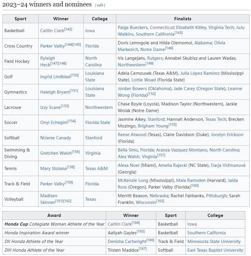 而凯特琳-克拉克继去年获奖后,今年背靠背再次荣膺,成为玛雅-摩尔(2010、2011)、游泳奥运冠军Tracy Caulkins(1982、1984)、垒球投手Rachel Garcia(2019、2021)后,第4名两次获奖的运动员。对此,克拉克在美联社的电话采访中表示:“这太难以置信了,能够与她相提并论,真是太不可思议了。她是我从10岁时就开始崇拜的偶像,我想做所有事都像她一样。”