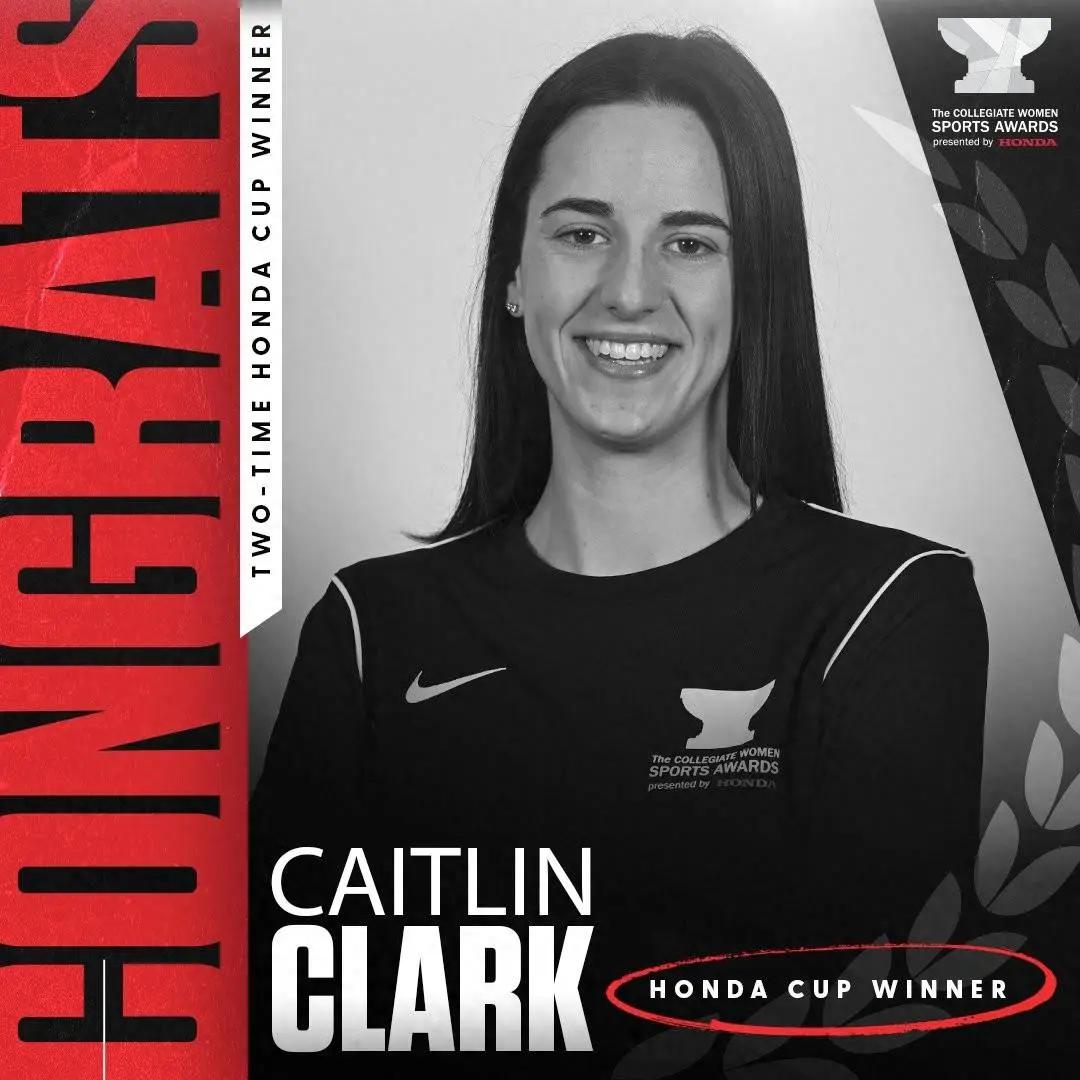 直播吧06月25日讯 WNBA新科状元凯特琳-克拉克今天当选2024年度大学女运动员奖,连续两年拿到该奖项的她,也与她的偶像玛雅-摩尔并肩,成为该奖项历史上仅有的4名两次获得该奖项的运动员。