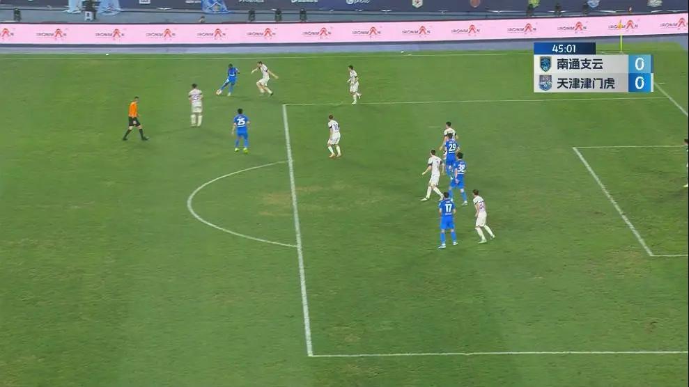 第45分钟,卡隆传中,卢永涛头球破门。边裁举旗示意越位,VAR介入,将近3分钟后确认没有越位,进球有效,南通1-0领先。