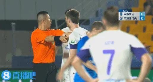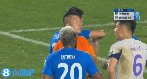 第14分钟,卡隆与巴顿对抗倒地,南通队员对此次犯规不满。↓