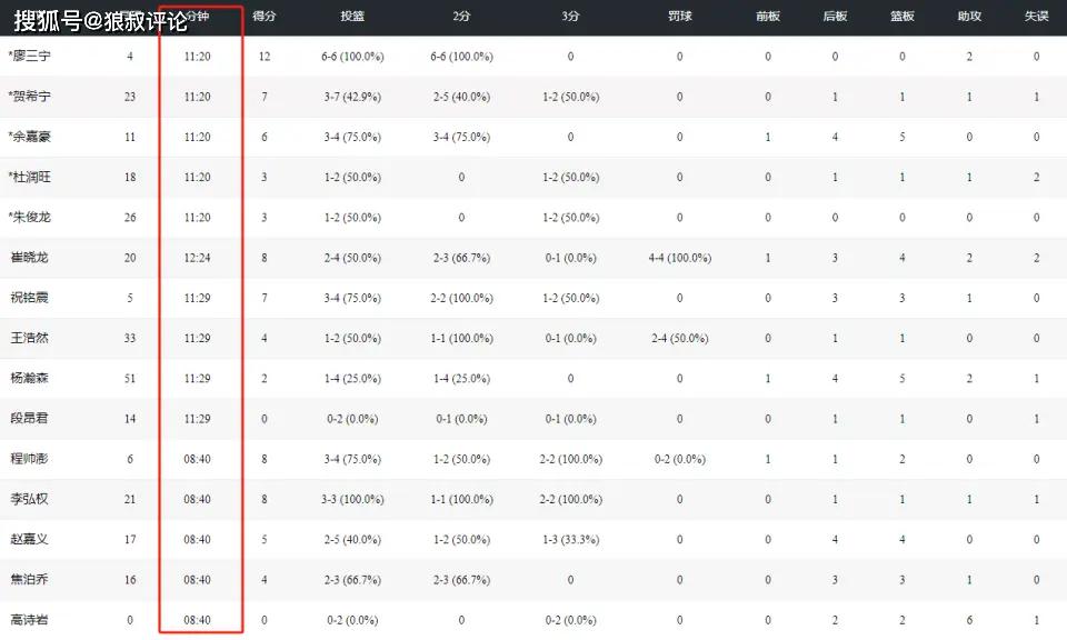 中国篮协更新了男篮和澳门黑熊队的热身赛数据统计,中国男篮21人全部获得出场机会,其中,廖三宁,贺希宁,杜润旺,朱俊龙,余嘉豪成为首发5虎,祝铭震,崔晓龙,焦柏乔等人表现出色,对于进入到正规比赛的轮换阵容恐是大概率的事件。