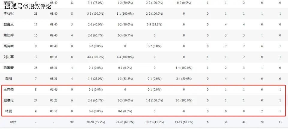 只是比较尴尬的事比较边缘的3个后卫,他们仿佛不属于测试阵容的考察范围,分别是王岚嵚,林葳,赵维伦。三人的出场时间都未能进入到相对比较固定的测试阵容名单,其中,林葳更是只有3分58秒创造全队出场时间的倒数第一。
