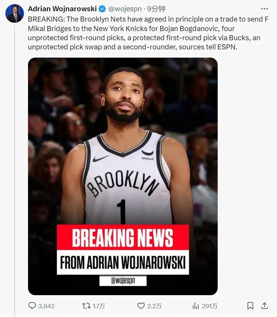 北京时间6月26日上午,一则重磅交易:篮网将“大桥”布里奇斯,和2026年次轮签交易至尼克斯,换来博扬、四个无保护首轮签(2025年、2027年、2029年和2031年)、2025年受保护首轮签(来自雄鹿),2028年首轮互换和2025年次轮签。
