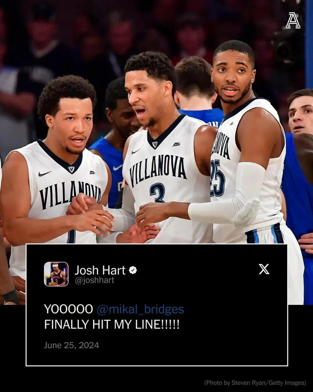 火箭的大交易目前还在酝酿,接下来说说布里奇斯和尼克斯!大桥更推写道:“这很疯狂哈哈哈。”为啥大桥很开心?因为纽约有三个好兄弟!尼克斯集齐了4位维拉诺瓦大学的校友——大桥布里奇斯、布伦森、约什-哈特和迪温琴佐。