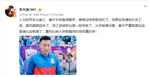 除了透露了郝伟的情况,还有一位知名媒体人则直接曝出了中国足坛知名球员秦升的情况。据媒体人李平康的爆料,在李铁事情发生后,有自知之明的秦升原本是跑得最早的,赛季还没结束就消失了。但是后来因为得到通知,让其来领补发的工资。没想到,原本已经玩消失的秦升,竟然又回来了,在领工资时被抓获。“人为财死鸟为食亡,秦升本来跑得最早,赛季没结束就消失了。结果后来通知补发工资,竟然真就回来了,领工资被抓也是一段传奇了。