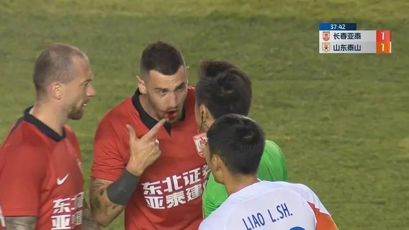 比赛第38分钟,毕津浩争顶中甩手打到罗西奇面部,后者满嘴是血,裁判向毕津浩出示黄牌。