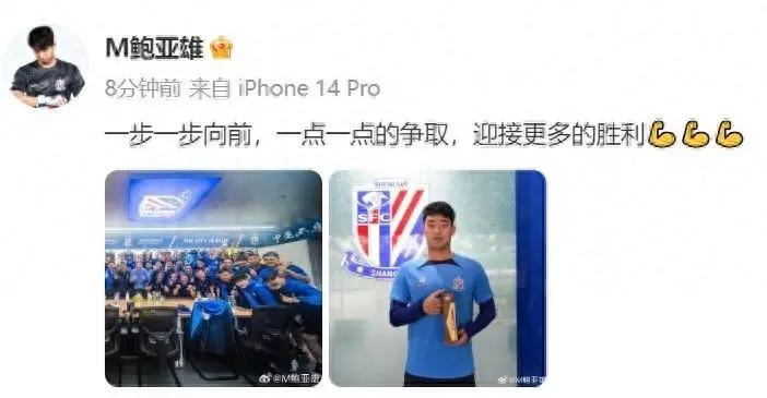 赛后,鲍亚雄在社媒分享球队在更衣室庆祝胜利的照片,并配文:“一步一步向前,一点一点的争取,迎接更多的胜利。”