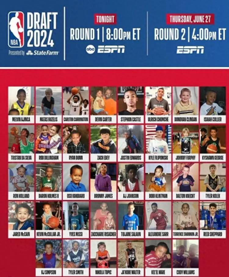 NBA官方晒出了本界参选新秀的童年照。克林根在1排第7位置,扎克-埃迪在2排4位。
