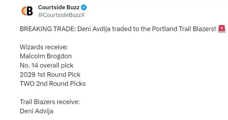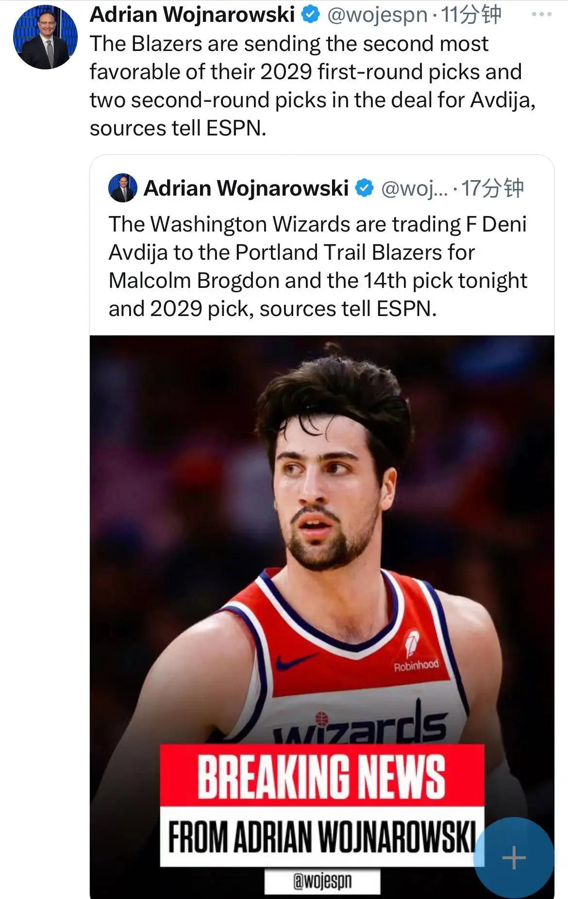 北京时间6月27日,根据ESPN记者Woj报道,奇才将前锋阿夫迪亚交易至开拓者,换回布罗格登加稍后选秀大会的首轮14号签、2029年的首轮选秀签、两个次轮签。