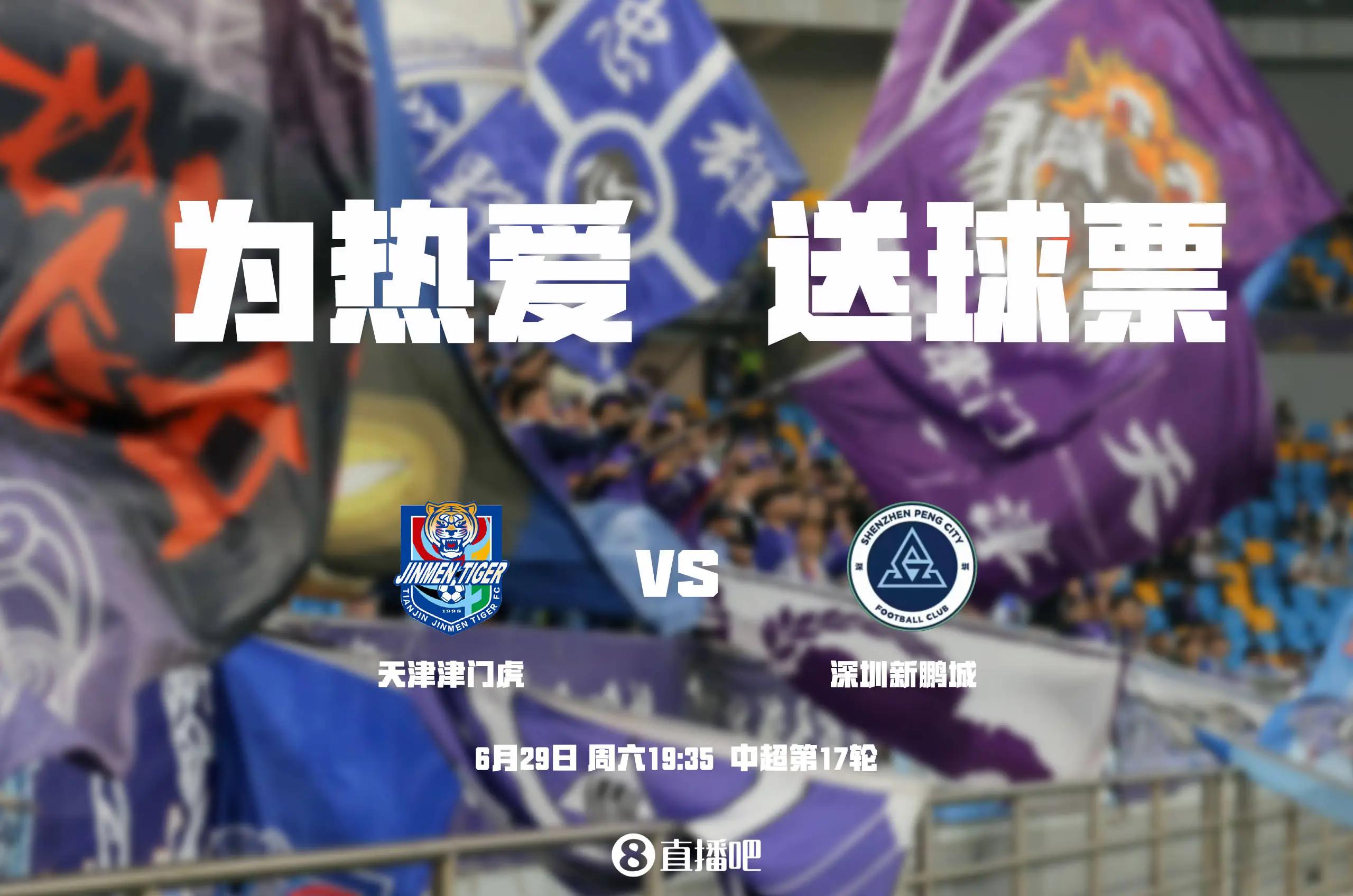 明天6月29日,晚上19:35,天津津门虎将坐镇主场迎战深圳新鹏城。已经4轮不胜的津门虎急需在主场用一场胜利止血。为了天津,永远进攻!小吧将送出4张本场比赛的门票,邀请吧友到现场做天津津门虎的第12人,在评论区留言即可赢取获奖机会!
