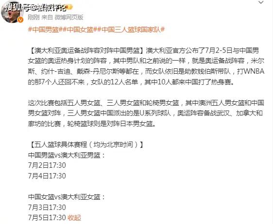北京时间6月27日,根据媒体人三土带刺发文:澳大利亚官方公布了7月2-5日与中国男女篮的奥运热身计划的阵容,其中男队和之前说的一样,就是奥运备战阵容,米尔斯、约什-吉迪、戴森-丹尼尔斯等都在,而女队依旧是助教钱伯斯带队,打WNBA的那7个人还回不来,女队的12人名单,其中10人都来中国打了热身赛。