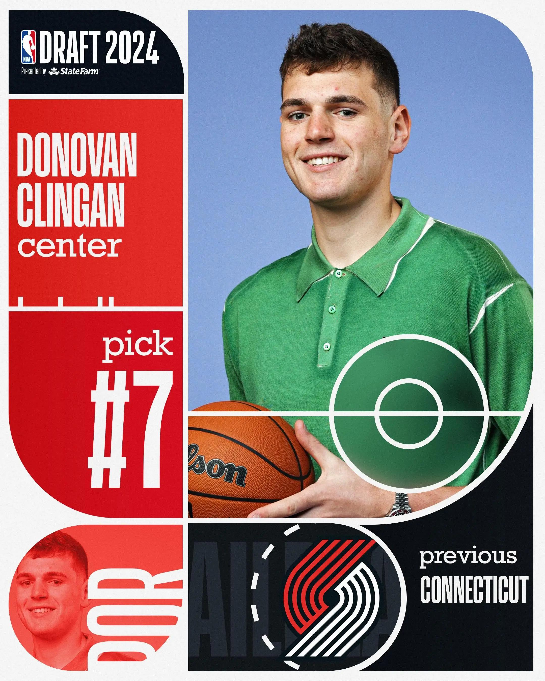 直播吧6月27日讯 2024年NBA选秀大会,开拓者用首轮7号签选中中锋克林根。