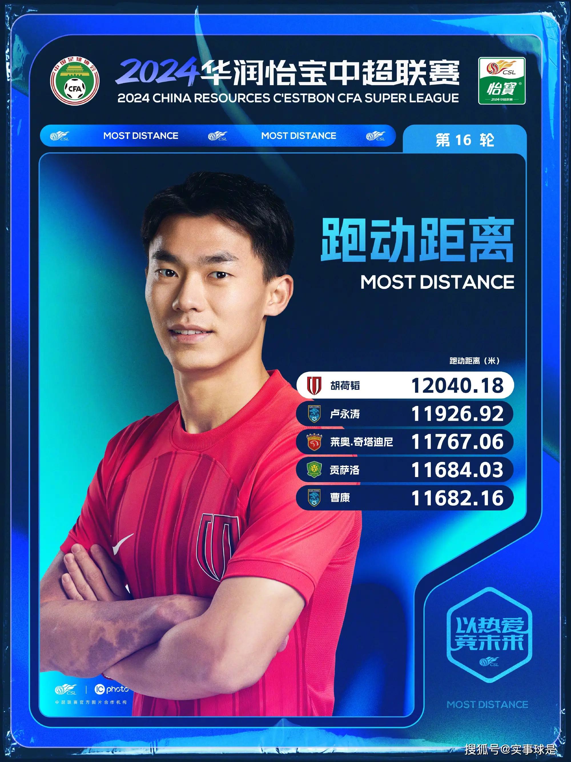 6月27日晚,中超官方发布了2024赛季中超联赛第16轮,也就是下半程首轮的跑动距离榜。共有5名球员登上榜单,分别是: