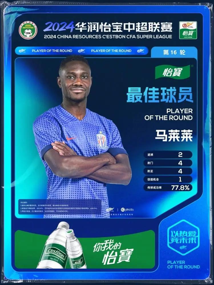 直播吧6月28日讯 中超第16轮结束后,联赛官方公布了本轮的最佳球员,上海申花外援前锋马莱莱当选。马莱莱在媒体评审环节获得6张第一顺位选票,拿到54分;在球迷投票环节,马莱莱的选票总数排名第一,最终他以总分84分当选第16轮最佳球员。